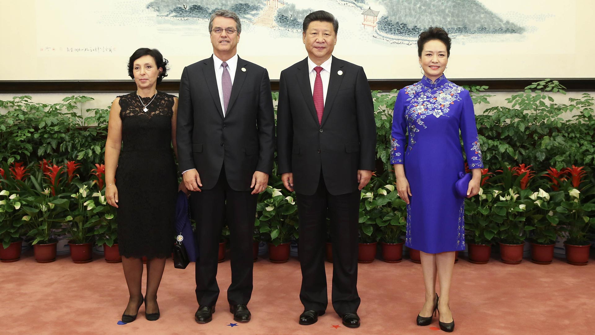 9月4日,国家主席习近平和夫人彭丽媛在杭州西子宾馆举行宴会,欢迎出席二十国集团领导人杭州峰会的外方代表团团长及所有嘉宾。这是习近平和彭丽媛迎候世界贸易组织总干事阿泽维多夫妇。新华社记者庞兴雷摄