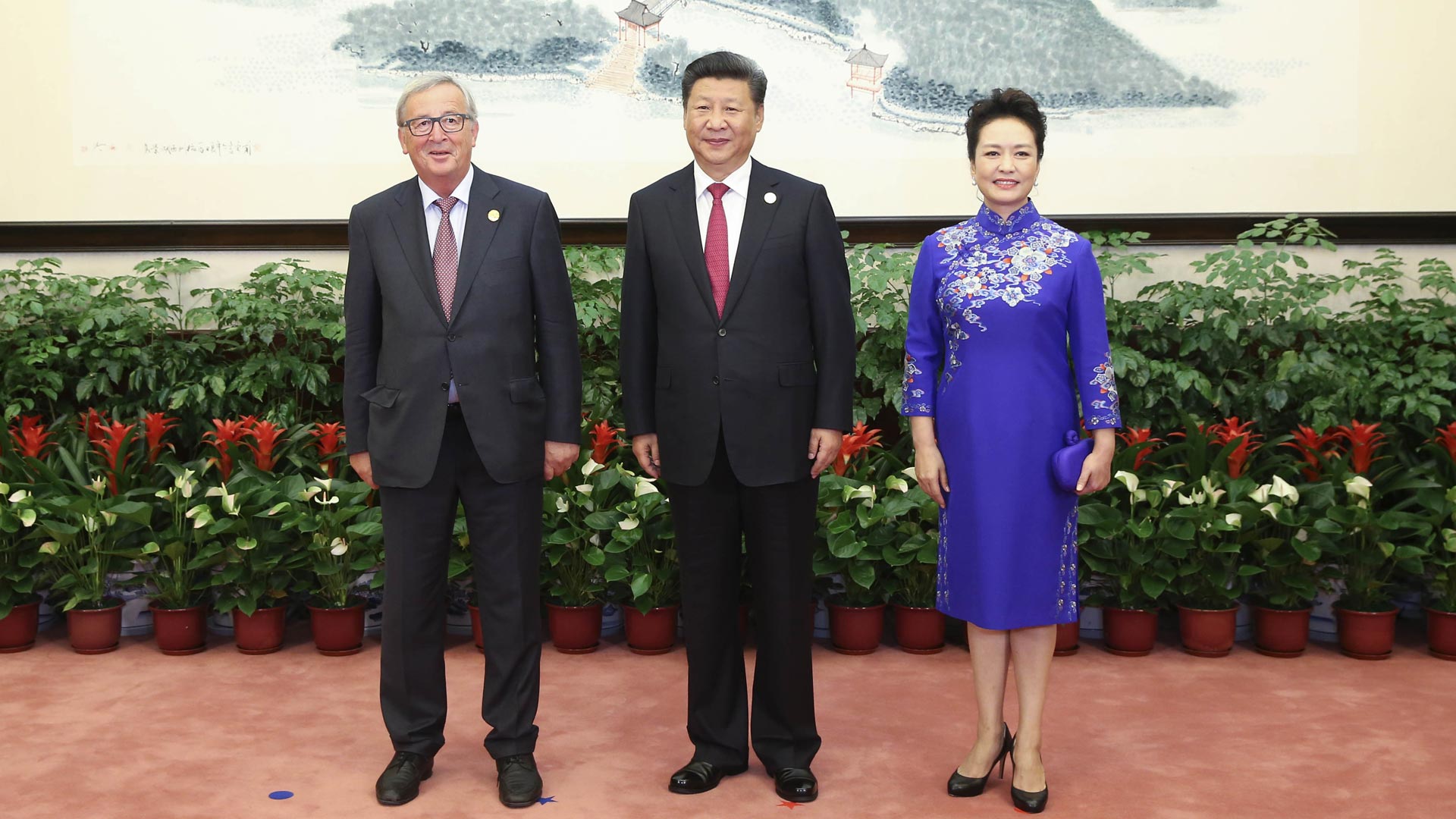 9月4日,国家主席习近平和夫人彭丽媛在杭州西子宾馆举行宴会,欢迎出席二十国集团领导人杭州峰会的外方代表团团长及所有嘉宾。这是习近平和彭丽媛迎候欧盟委员会主席容克。新华社记者庞兴雷摄