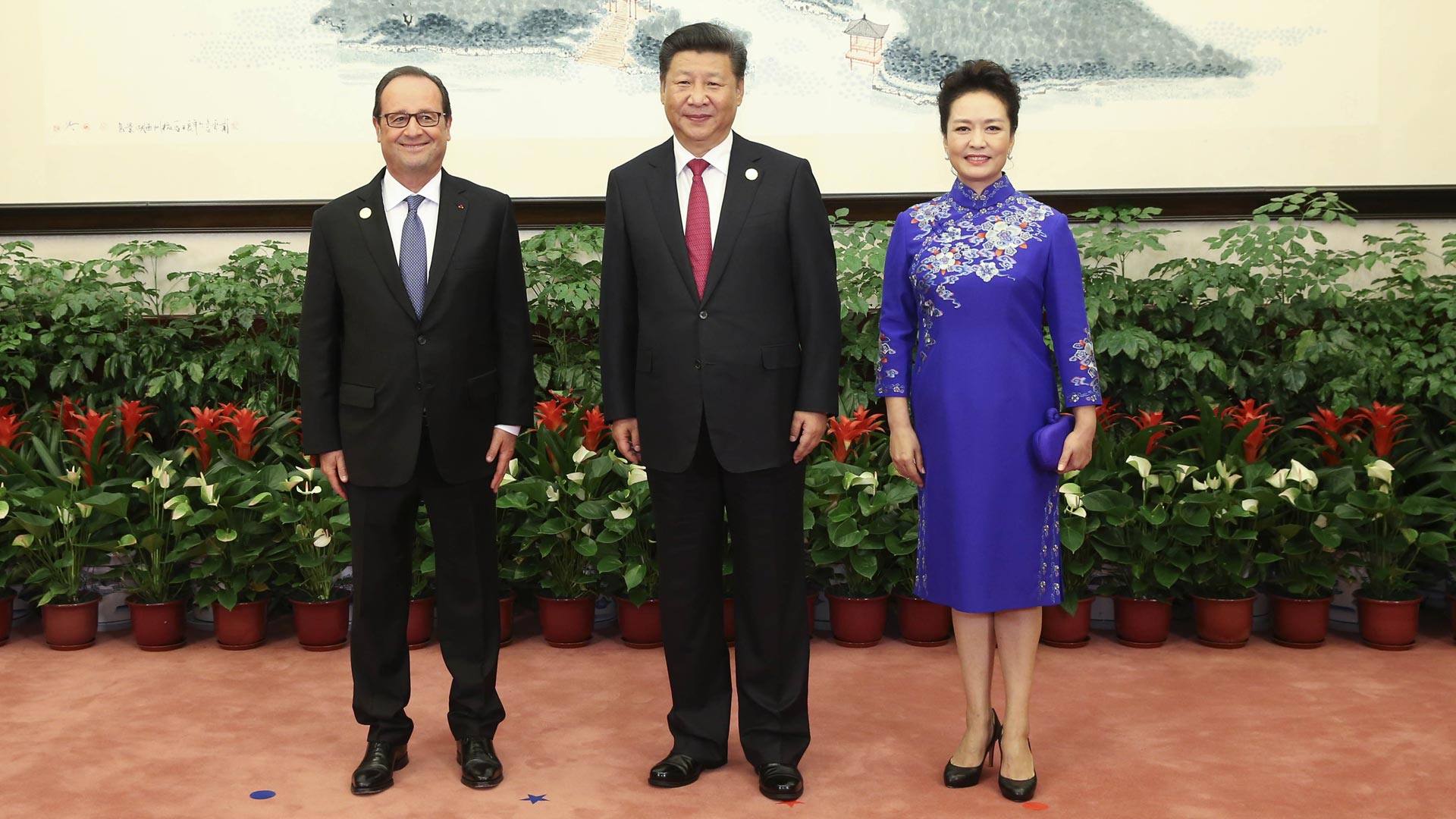 9月4日,国家主席习近平和夫人彭丽媛在杭州西子宾馆举行宴会,欢迎出席二十国集团领导人杭州峰会的外方代表团团长及所有嘉宾。这是习近平和彭丽媛迎候法国总统奥朗德。新华社记者庞兴雷摄