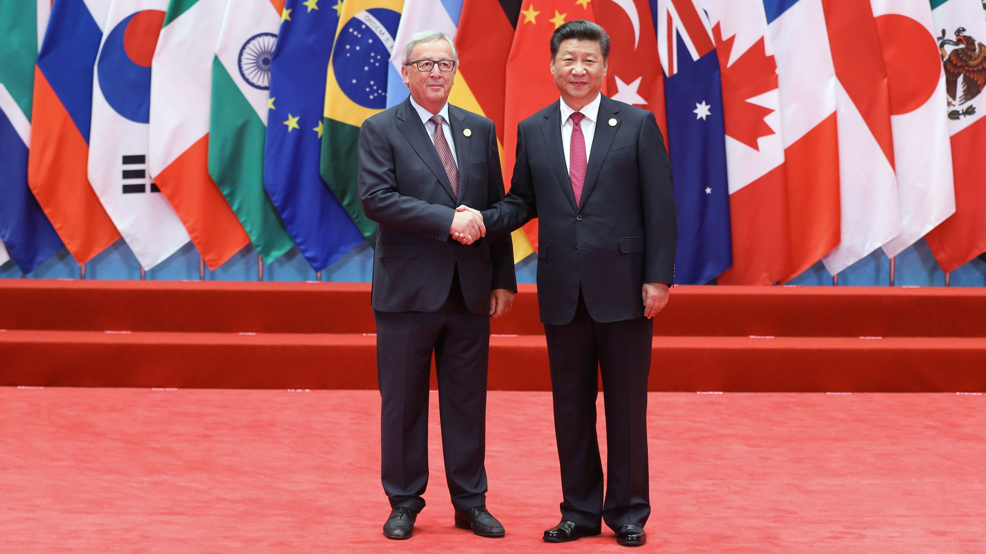 9月4日,二十国集团领导人第十一次峰会在杭州举行,中国国家主席习近平在国际博览中心迎接各成员和嘉宾国领导人、有关国际组织负责人。这是习近平与欧盟委员会主席容克握手。 新华社记者马占成摄