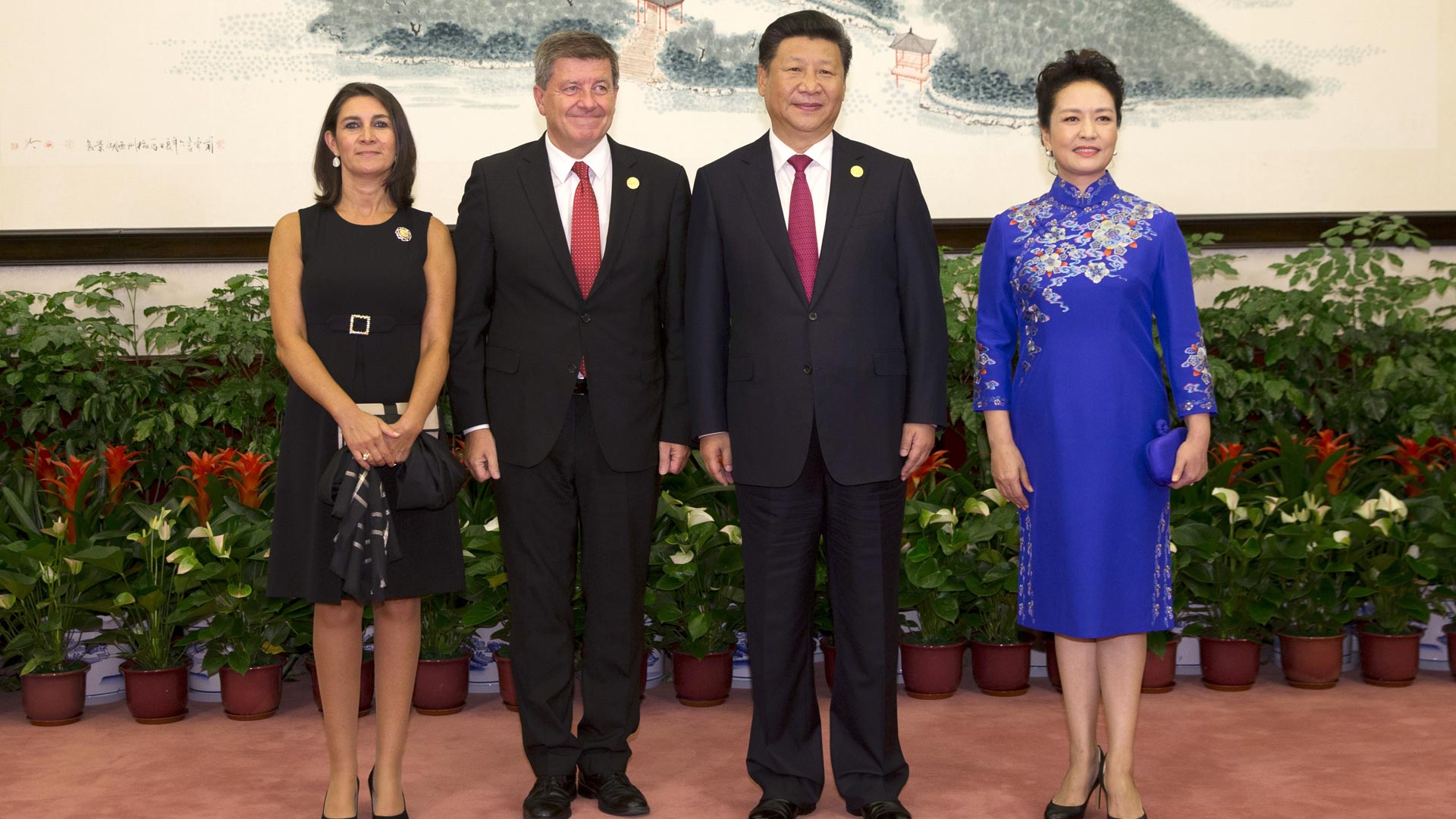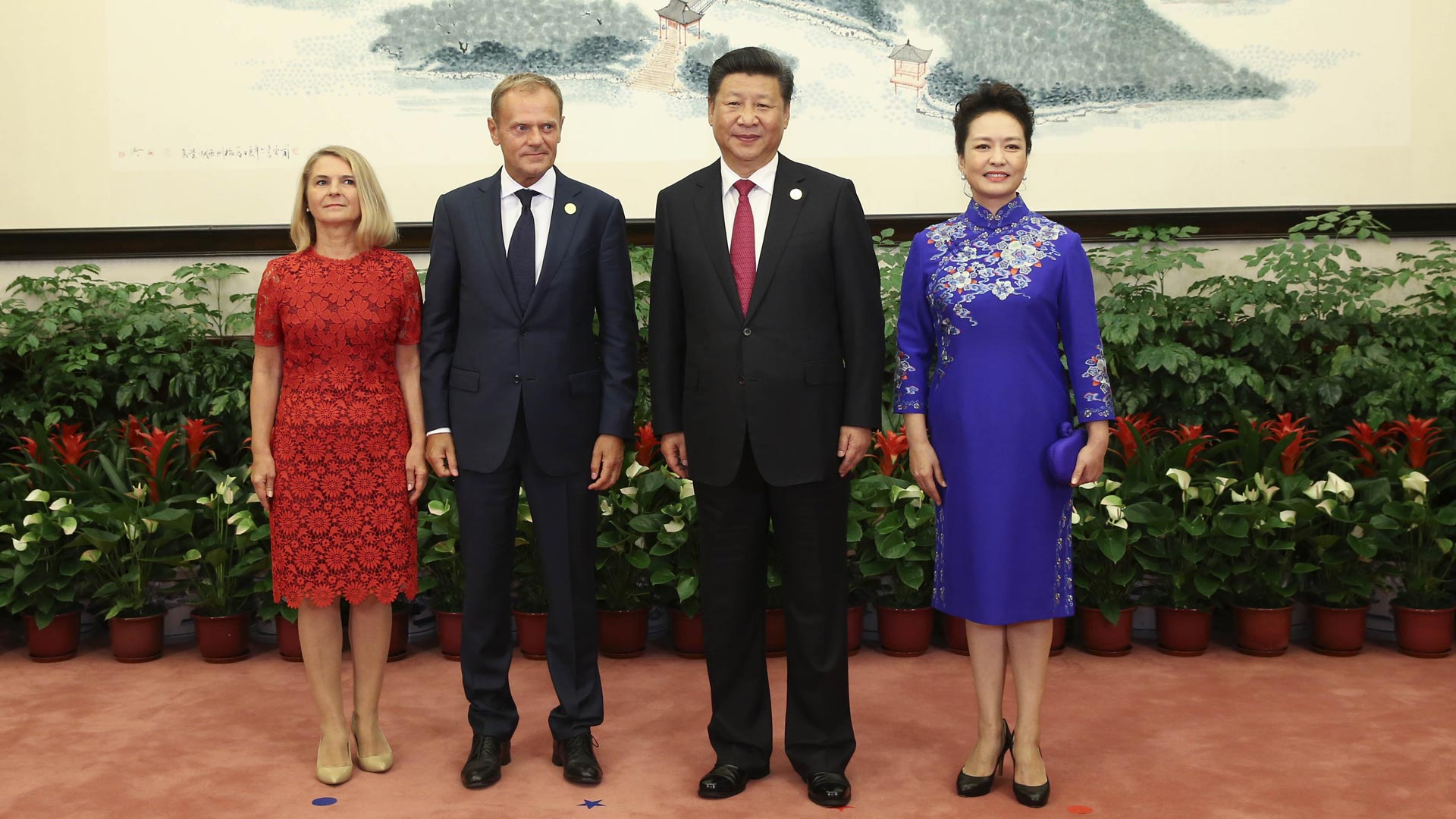 9月4日,国家主席习近平和夫人彭丽媛在杭州西子宾馆举行宴会,欢迎出席二十国集团领导人杭州峰会的外方代表团团长及所有嘉宾。这是习近平和彭丽媛迎候欧洲理事会主席图斯克夫妇。新华社记者庞兴雷摄