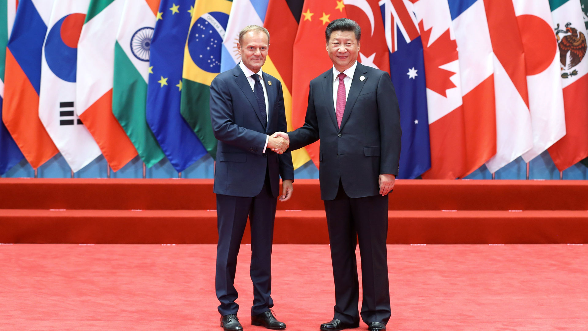 9月4日,二十国集团领导人第十一次峰会在杭州举行,中国国家主席习近平在国际博览中心迎接各成员和嘉宾国领导人、有关国际组织负责人。这是习近平与欧洲理事会主席图斯克握手。 新华社记者马占成摄