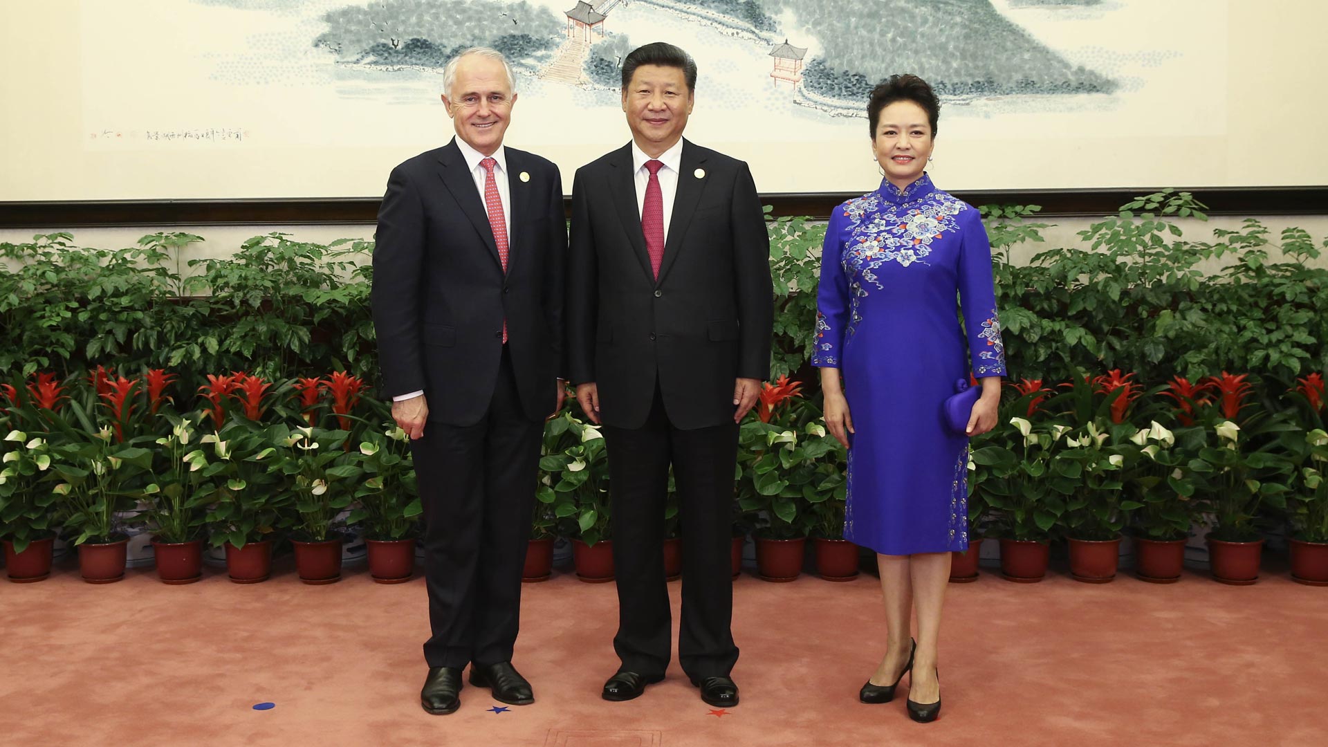 9月4日,国家主席习近平和夫人彭丽媛在杭州西子宾馆举行宴会,欢迎出席二十国集团领导人杭州峰会的外方代表团团长及所有嘉宾。这是习近平和彭丽媛迎候澳大利亚总理特恩布尔。新华社记者庞兴雷摄
