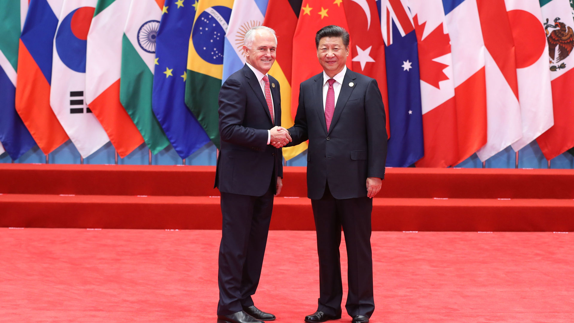 9月4日,二十国集团领导人第十一次峰会在杭州举行,中国国家主席习近平在国际博览中心迎接各成员和嘉宾国领导人、有关国际组织负责人。这是习近平与澳大利亚总理特恩布尔握手。 新华社记者马占成摄