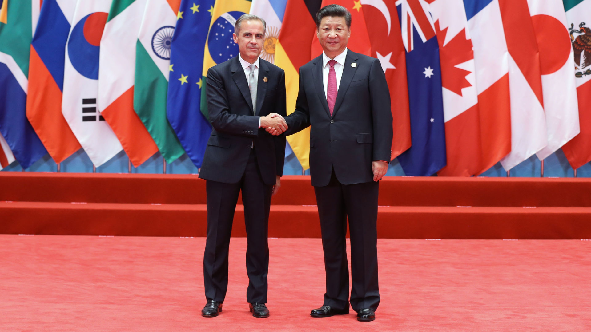 9月4日,二十国集团领导人第十一次峰会在杭州举行,中国国家主席习近平在国际博览中心迎接各成员和嘉宾国领导人、有关国际组织负责人。这是习近平与金融稳定理事会主席卡尼握手。新华社记者马占成摄