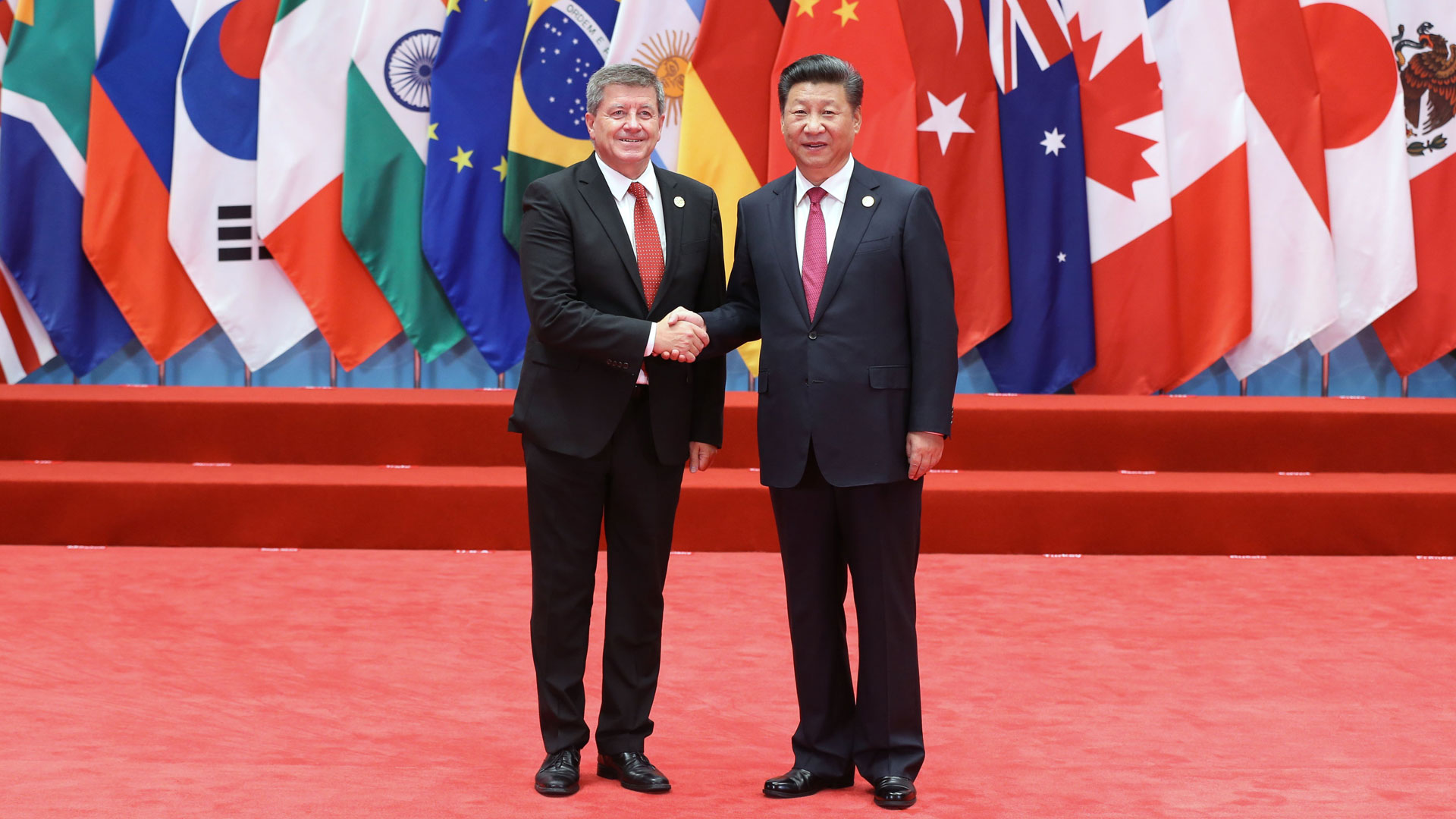 9月4日,二十国集团领导人第十一次峰会在杭州举行,中国国家主席习近平在国际博览中心迎接各成员和嘉宾国领导人、有关国际组织负责人。这是习近平与巴西总统特梅尔握手。 新华社记者马占成摄