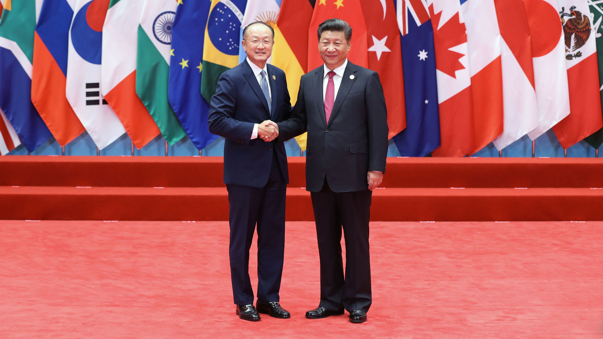 9月4日,二十国集团领导人第十一次峰会在杭州举行,中国国家主席习近平在国际博览中心迎接各成员和嘉宾国领导人、有关国际组织负责人。 这是习近平与世界银行行长金墉握手。新华社记者马占成摄