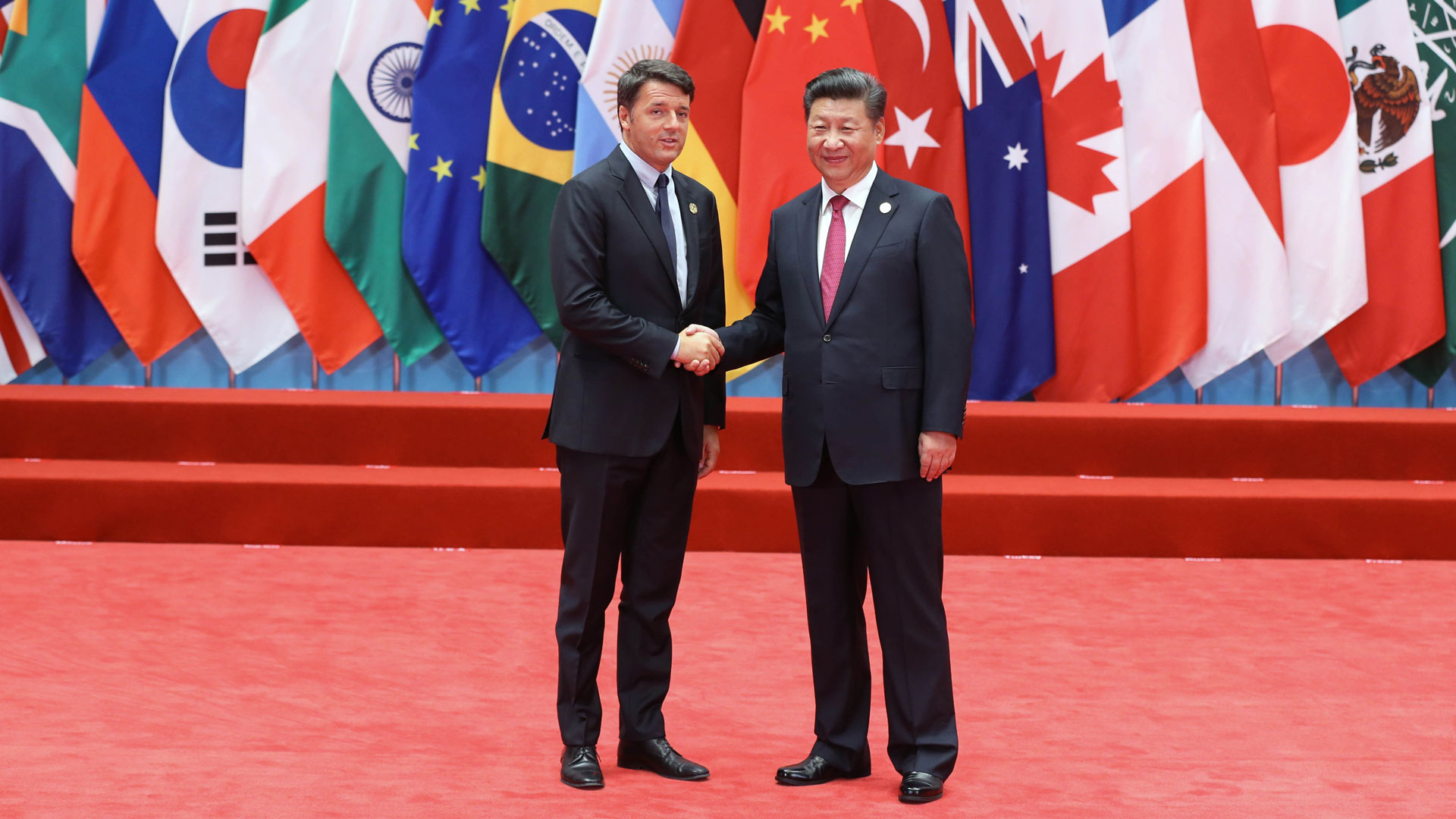 9月4日,二十国集团领导人第十一次峰会在杭州举行,中国国家主席习近平在国际博览中心迎接各成员和嘉宾国领导人、有关国际组织负责人。这是习近平与意大利总理伦齐握手。 新华社记者马占成摄