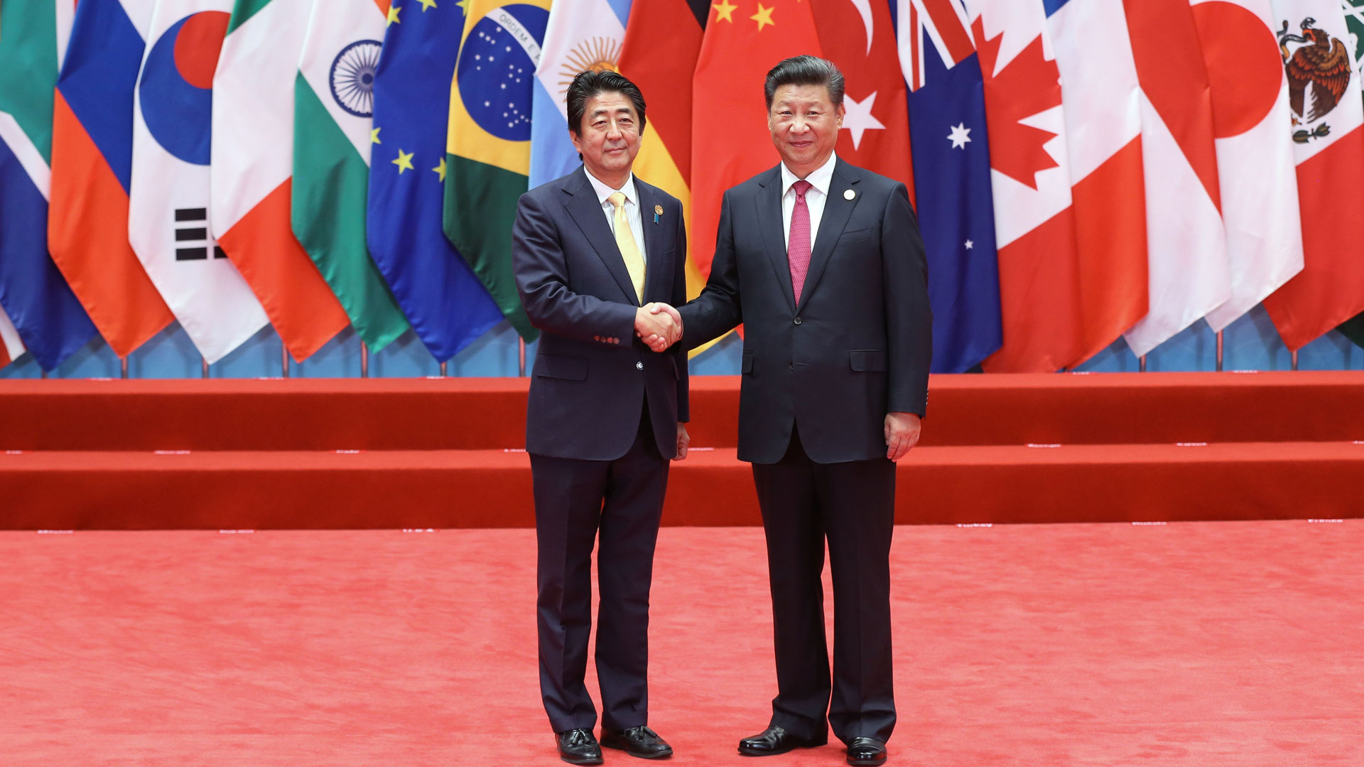 9月4日,二十国集团领导人第十一次峰会在杭州举行,中国国家主席习近平在国际博览中心迎接各成员和嘉宾国领导人、有关国际组织负责人。这是习近平与日本首相安倍晋三握手。 新华社记者马占成摄