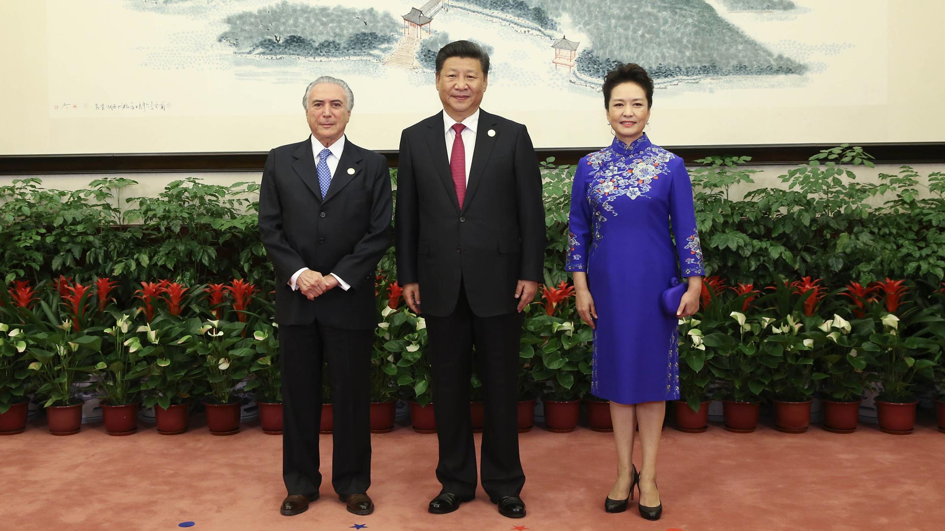9月4日,国家主席习近平和夫人彭丽媛在杭州西子宾馆举行宴会,欢迎出席二十国集团领导人杭州峰会的外方代表团团长及所有嘉宾。这是习近平和彭丽媛迎候巴西总统特梅尔。新华社记者庞兴雷摄
