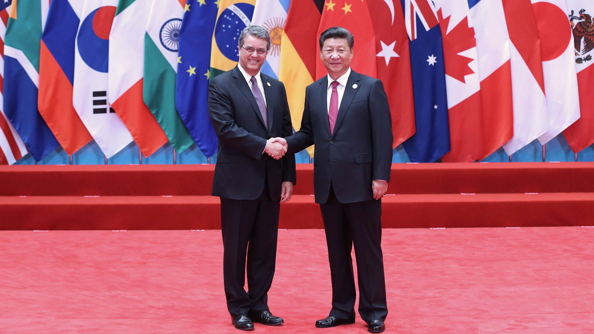 9月4日,二十国集团领导人第十一次峰会在杭州举行,中国国家主席习近平在国际博览中心迎接各成员和嘉宾国领导人、有关国际组织负责人。这是习近平与世界贸易组织总干事阿泽维多握手。 新华社记者马占成摄