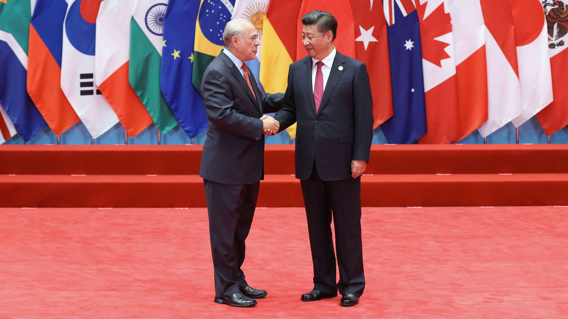 9月4日,二十国集团领导人第十一次峰会在杭州举行,中国国家主席习近平在国际博览中心迎接各成员和嘉宾国领导人、有关国际组织负责人。这是习近平与经济合作与发展组织秘书长古里亚握手。 新华社记者马占成摄