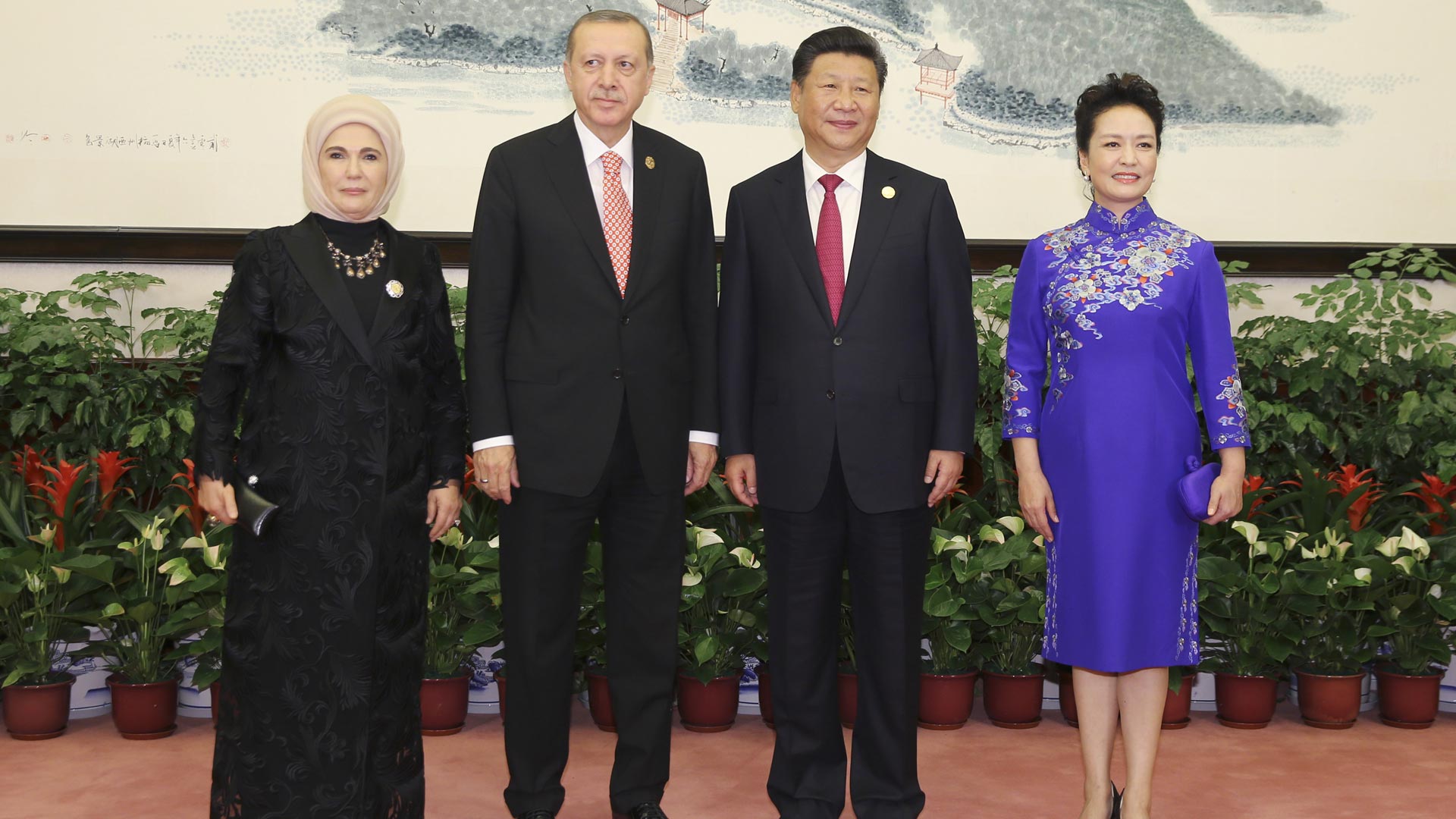 9月4日,国家主席习近平和夫人彭丽媛在杭州西子宾馆举行宴会,欢迎出席二十国集团领导人杭州峰会的外方代表团团长及所有嘉宾。这是习近平和彭丽媛迎候土耳其总统埃尔多安夫妇。新华社记者丁林摄