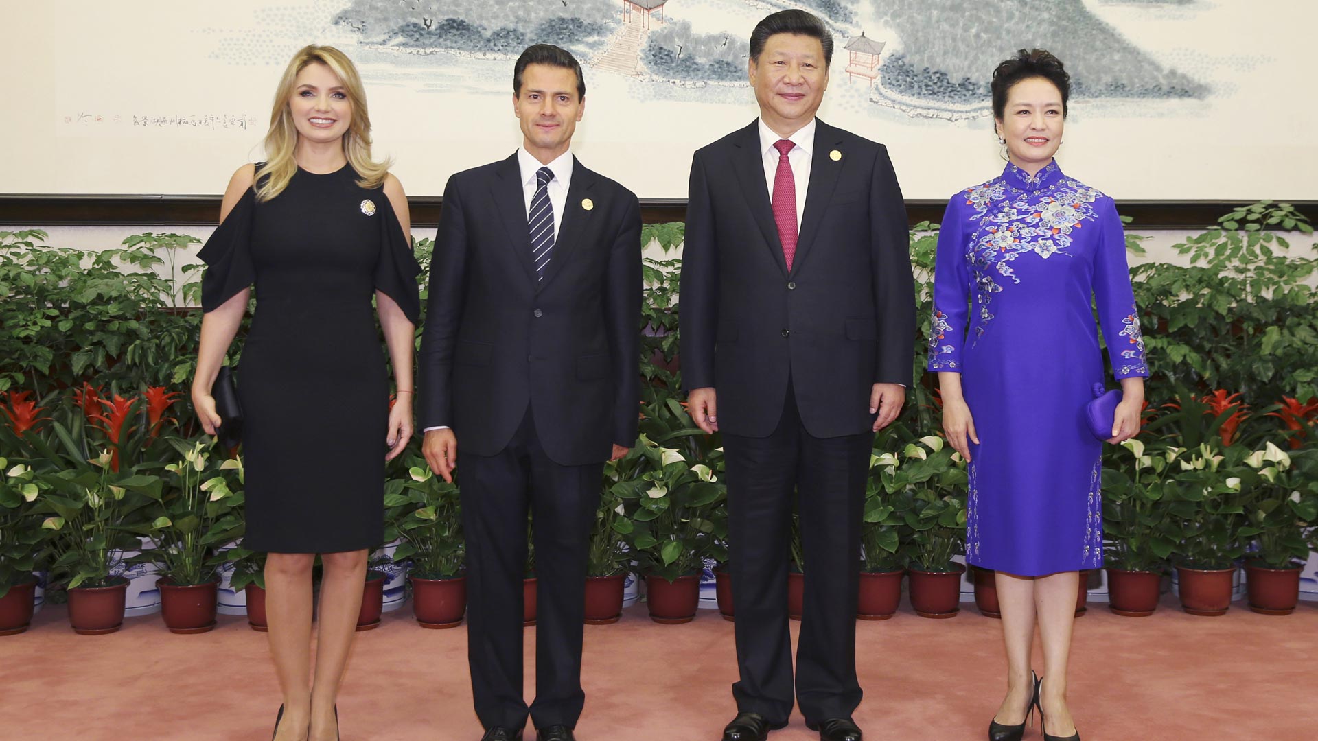 9月4日,国家主席习近平和夫人彭丽媛在杭州西子宾馆举行宴会,欢迎出席二十国集团领导人杭州峰会的外方代表团团长及所有嘉宾。这是习近平和彭丽媛迎候墨西哥总统培尼亚夫妇。新华社记者丁林摄