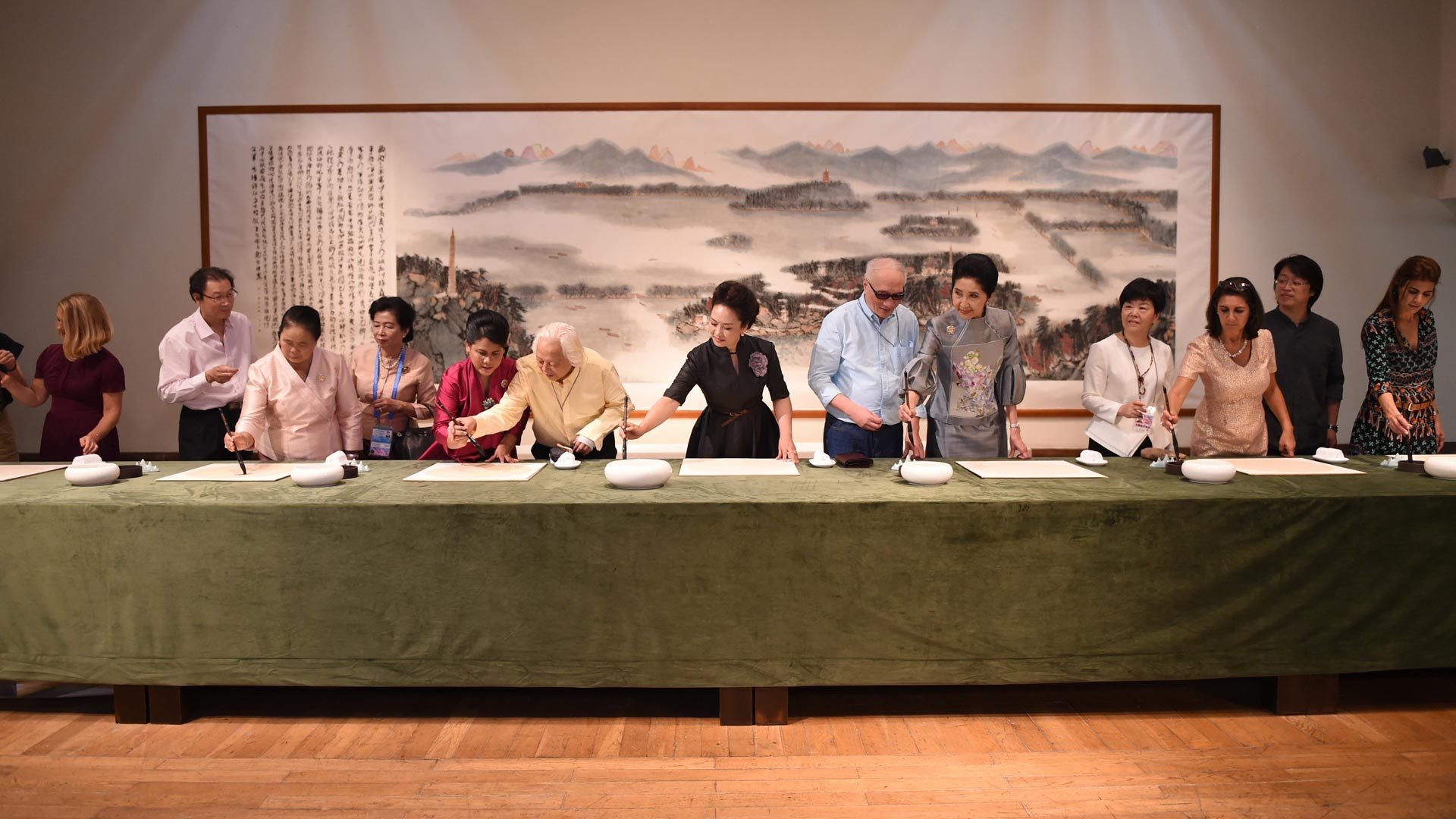 9月5日,国家主席习近平夫人彭丽媛邀请出席二十国集团领导人杭州峰会外方代表团团长夫人参观中国美术学院。这是彭丽媛与来宾一同书写汉字“和”。新华社记者 谢环驰 摄