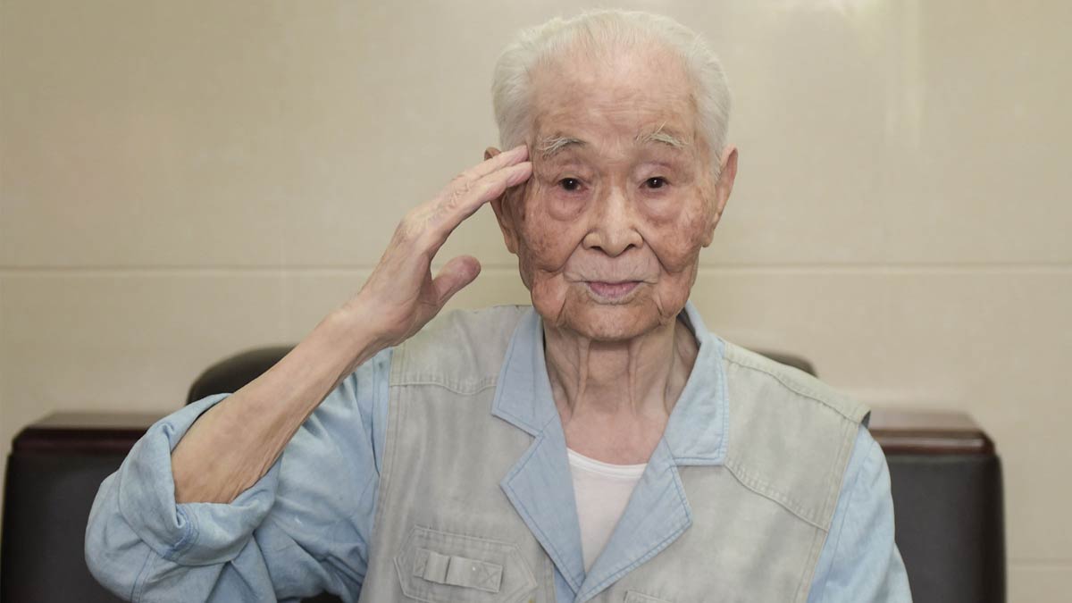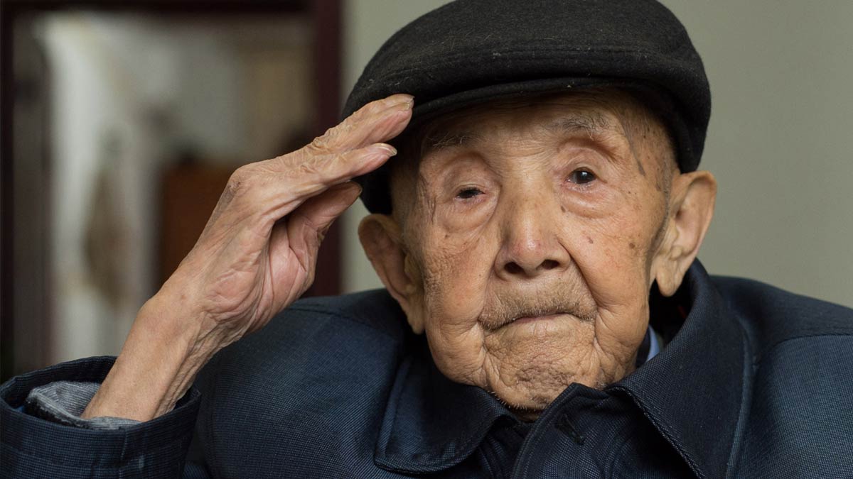 老红军赵仁宽,1919年6月出生,四川省巴中人。1934年10月参加红军。赵仁宽最深刻的战斗经历是强渡嘉陵江时,发生在广元苍溪境内的马桑垭战斗。望着漫山遍野的敌军尸体,赵仁宽第一次感受到了革命的艰辛与不易。图为老红军赵仁宽敬军礼。新华社记者 薛玉斌摄