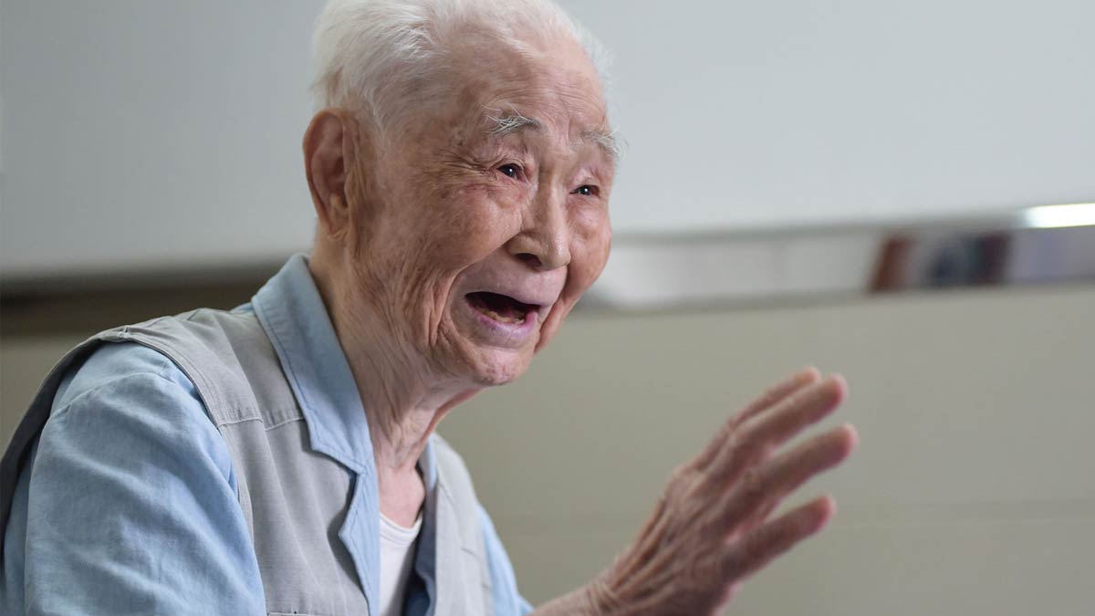 老红军王承登,1915年7月出生,江西省兴国县人。1930年参加革命,1934年加入中国共产党。王承登印象最深刻的战斗经历是1936年在瓦窑堡战斗中,一颗子弹从他左眼射进、右耳射出,差点牺牲。图为王承登讲诉长征经历(5月27日摄)。新华社记者 万象摄