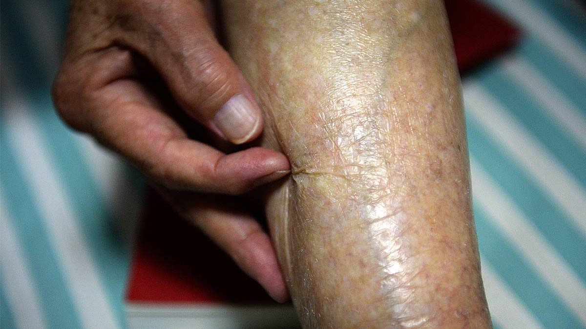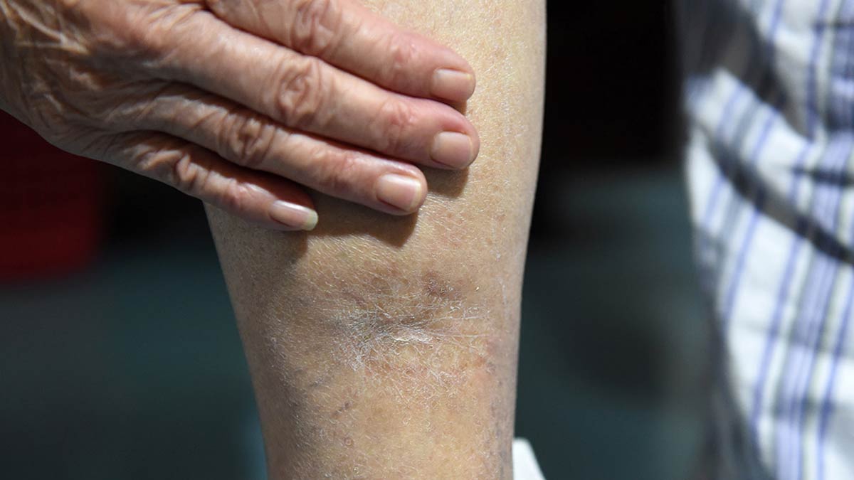 老红军郝毅,1917年12月出生,安徽省金寨县人。1936年10月加入中国共产党,先后参加过第三、四次反“围剿”、二万五千里长征、平津战役、抗美援朝战争等,在战争中左小腿被炸伤。图为郝毅在长征战斗中受伤留下的疤痕。新华社记者 陆波岸摄
