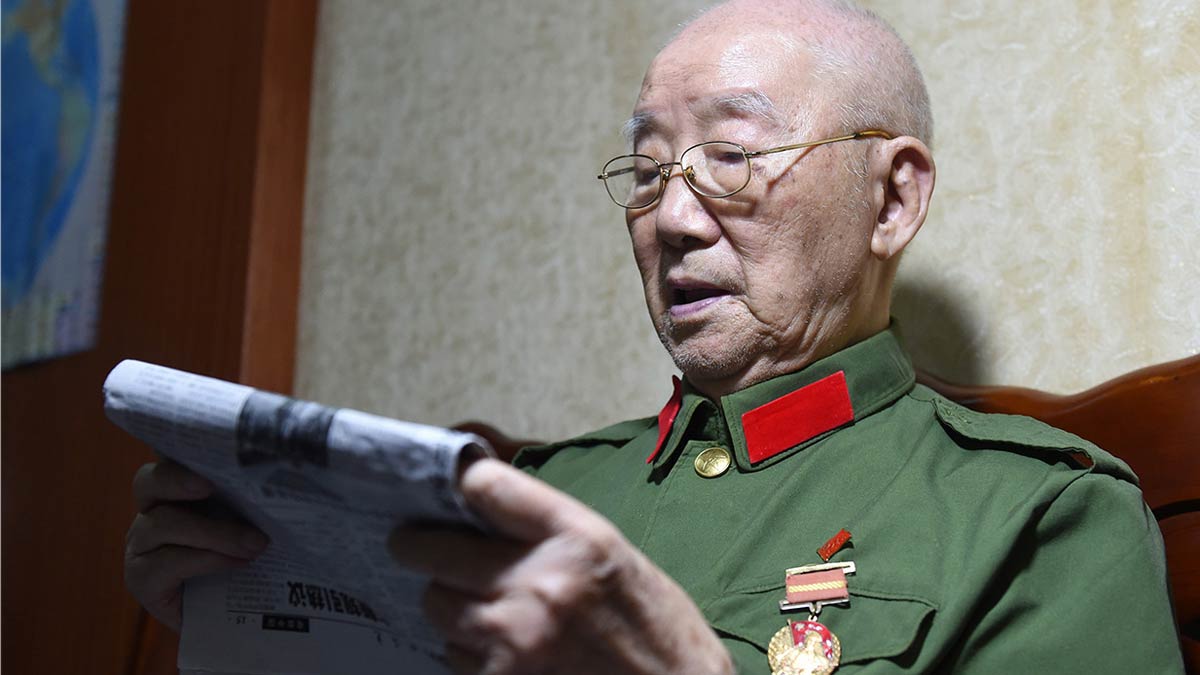 老红军郝毅,1917年12月出生,安徽省金寨县人。1936年10月加入中国共产党,先后参加过第三、四次反“围剿”、二万五千里长征、平津战役、抗美援朝战争等,在战争中左小腿被炸伤。图为郝毅在广西南宁市的解放军第三〇三医院看报(10月11日摄)。新华社记者 陆波岸摄
