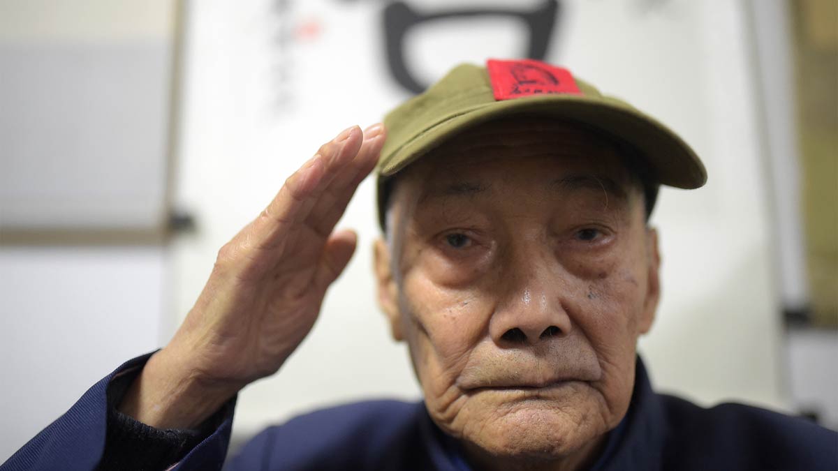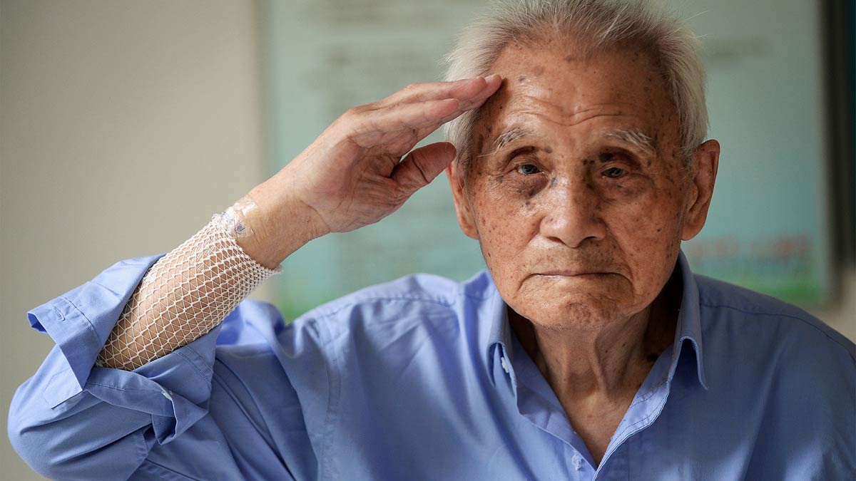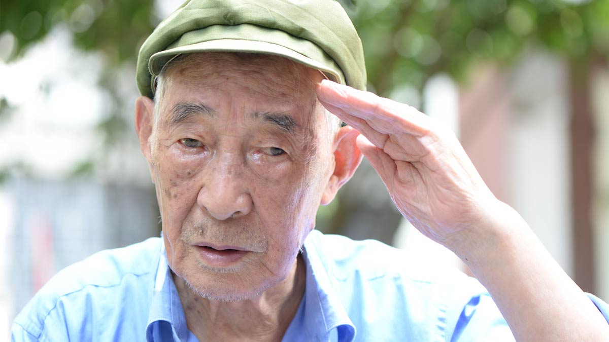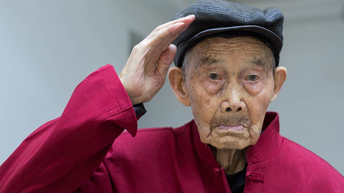 老红军方槐,1917年出生,江西省于都县人。他12岁就参加了儿童团。1931年加入中国共产主义青年团。1933年加入中国共产党。方槐印象最深刻的战斗经历是:第五次反“围剿”失败后,中央红军被迫撤离苏区开始长征。“湘江战役是我们打得最苦、死人最多的一次战役。天上有飞机,地下有追兵。我看到清澈的河水都被红军战士的鲜血染红了。” 图为老红军方槐敬军礼。新华社记者 程敏摄