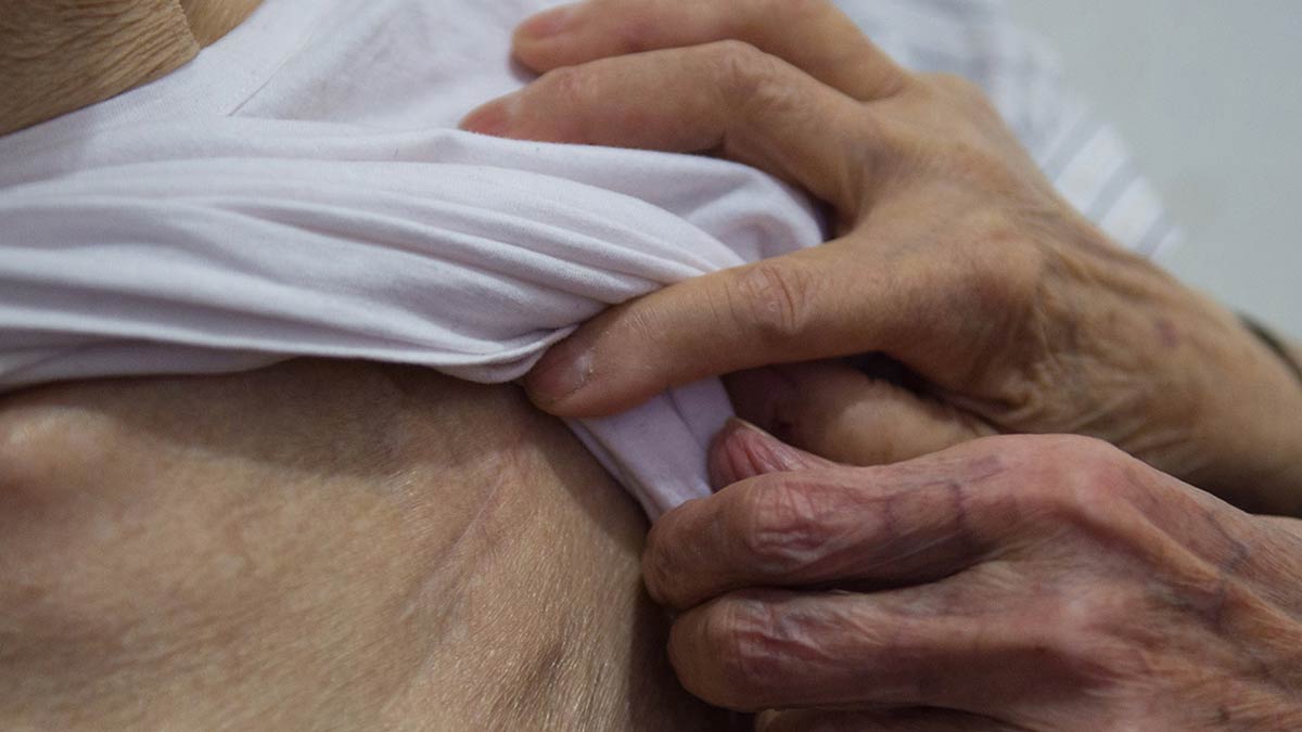 老红军任群,1919年10月生于四川省通江县。1933年参加红四方面军,1935年随红四方面军参加长征。从军生涯中,主要负责机要通讯工作。图为任群左胸口留下的弹片创伤。新华社记者 江宏景摄