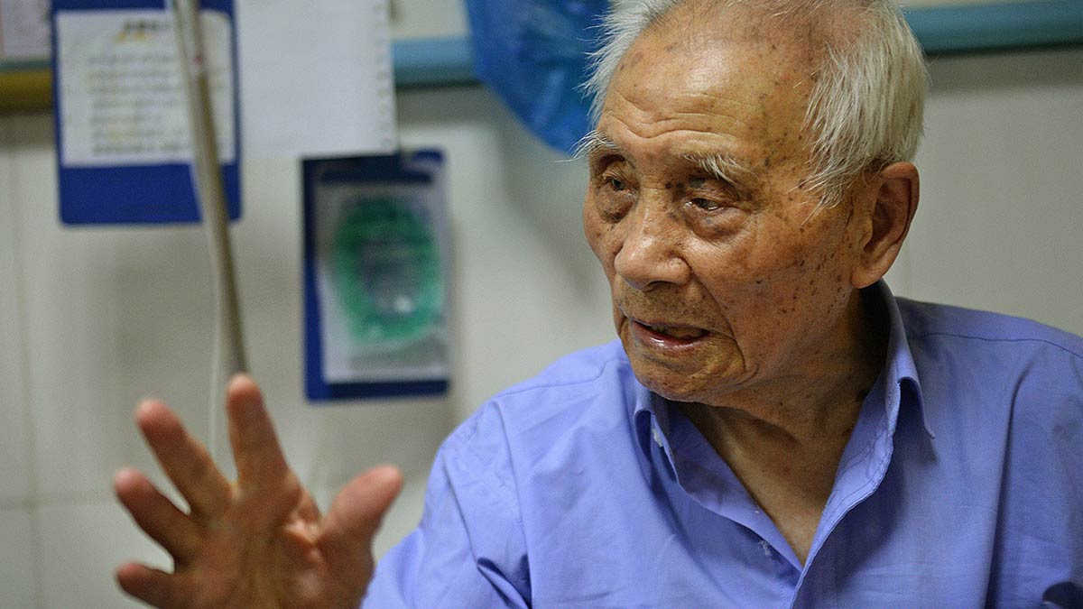 老红军方槐,1917年出生,江西省于都县人。他12岁就参加了儿童团。1931年加入中国共产主义青年团。1933年加入中国共产党。方槐印象最深刻的战斗经历是:第五次反“围剿”失败后,中央红军被迫撤离苏区开始长征。“湘江战役是我们打得最苦、死人最多的一次战役。天上有飞机,地下有追兵。我看到清澈的河水都被红军战士的鲜血染红了。” 图为方槐讲述他印象最深刻的战斗经历。新华社记者 程敏摄