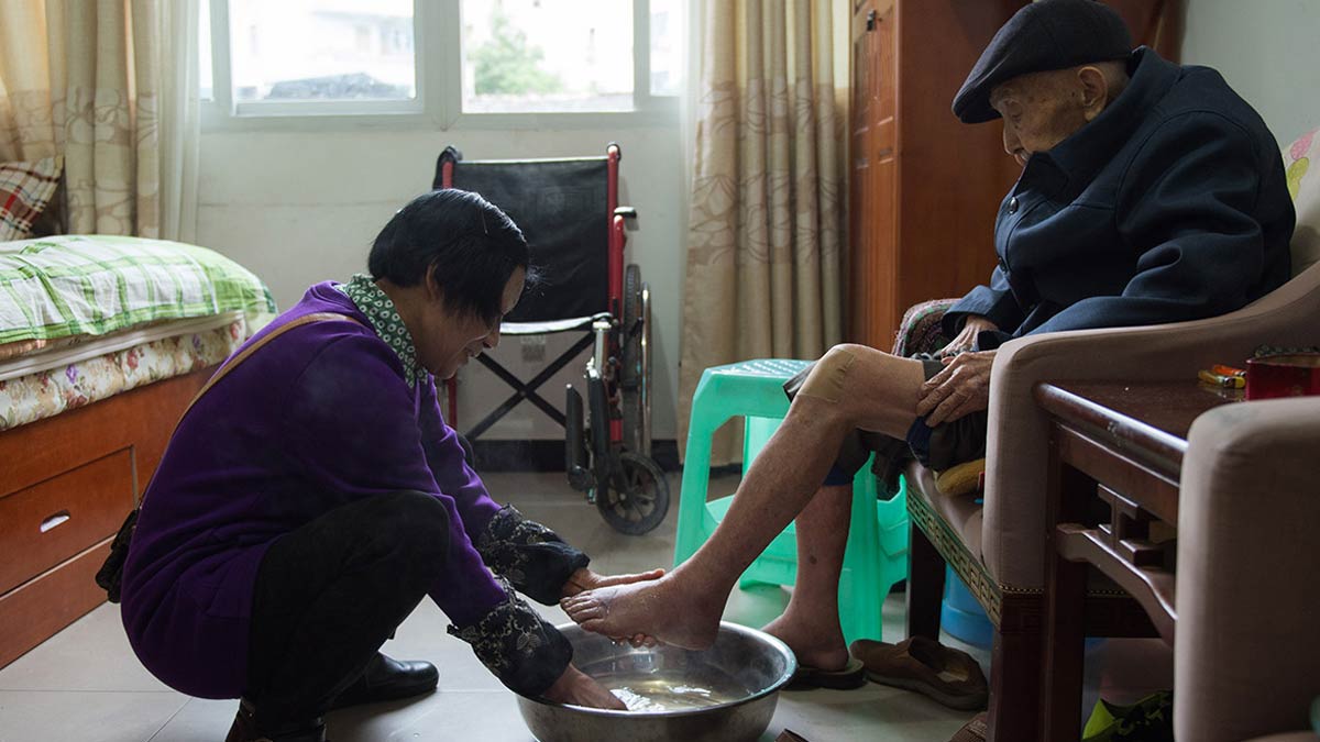 老红军王凤文,1917年7月出生, 四川省巴中市人。1933年5月,王凤文参加革命,1934年参加长征,1935年加入中国共产党。王凤文印象最深刻的一场战役是1936年1月的高台战役。王凤文和战友遭遇马步芳的骑兵,血战5天5夜。图为侄女孙继书为王凤文护理(10月12日摄)。新华社记者 江宏景摄