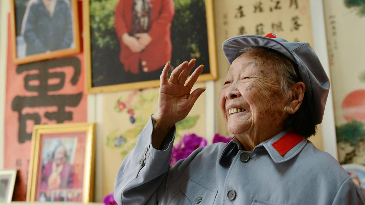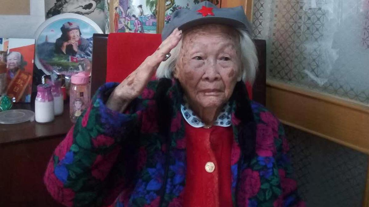 老红军王定国,1913年出生于四川省营山县。1933年,她参加红军,加入中国共产党。1936年翻越雪山时,王定国的一根脚趾被冻掉。她曾在94岁高龄时重走长征路,探望还健在的老战友和房东乡亲。图为老红军王定国敬军礼(10月10日,谢亚旭摄)。