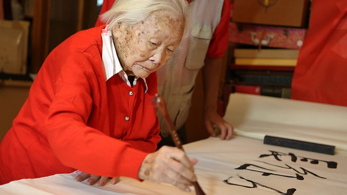 老红军王定国,1913年出生于四川省营山县。1933年,她参加红军,加入中国共产党。1936年翻越雪山时,王定国的一根脚趾被冻掉。她曾在94岁高龄时重走长征路,探望还健在的老战友和房东乡亲。图为王定国在家中题写“长征万岁”(9月21日,新华社记者琚振华摄)。