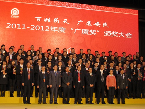 经国家批准,中国房地产业协会、住房和城乡建设部住宅产业化促进中心共同组织开展的2011―2012年度“广厦奖”评选结果于11月22日揭晓,全国23个省、自治区、直辖市共73个房地产项目获得了2011―2012年度“广厦奖”殊荣。颁奖大会于11月22日在北京京西宾馆隆重举行。中国房地产业协会会长刘志峰,住房和城乡建设部房地产监管司司长沈建忠,住房和城乡建设部标准定额司司长刘灿,住房和城乡建设部改革与发展司副司长段广平,住房和城乡建设部住房保障司副司长王平,住房和城乡建设部住宅产业化促进中心主任杨榕,中国房地产业协会副会长朱中一、秘书长苗乐如等有关领导出席会议,并分别向获奖项目开发单位和参建单位颁发了奖杯及证书。各省、自治区、直辖市建设行政管理部门、房地产业协会(开发协会)、住宅产业化促进中心(办公室)、获奖单位的代表和参加中国房地产业协会六届四次理事会、中国房地产研究会五届五次理事会、中国房地产采购平台启动仪式的代表及新闻媒体等600余人出席了大会。