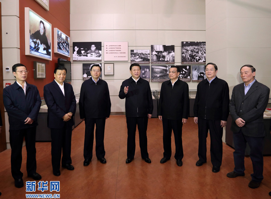 11月29日,中共中央总书记、中央军委主席习近平和中央政治局常委李克强、张德江、俞正声、刘云山、王岐山、张高丽等来到国家博物馆,参观《复兴之路》展览。新华社记者 兰红光 摄