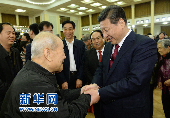 1月29日,中共中央、国务院在北京人民大会堂举行2014年春节团拜会。这是中共中央总书记、国家主席、中央军委主席习近平同首都各界人士亲切交谈,祝贺新春。新华社记者 马占成 摄