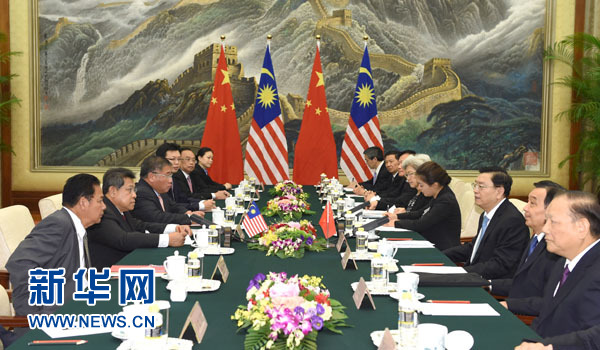 6月24日,全国人大常委会委员长张德江在北京人民大会堂与马来西亚国会下议院议长潘迪卡尔举行会谈。新华社记者 马占成 摄