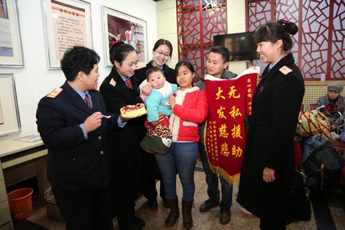 11月25日,在北京站素萍服务室上演了感人一幕——一年前受过帮助的湖南旅客付冰夫妇怀抱一周岁儿子送来了一面锦旗。在得知小晨祥刚好是当天的生日后,素萍服务组买来生日蛋糕,为小宝宝过起了生日。