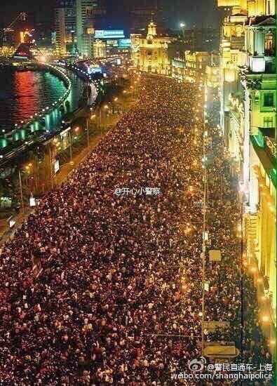 上海市公安局官方微博@警民直通车-上海于12月31日晚23:32发布微博播报外滩实时消息称:“外滩迎新场面壮观虽然人多,但秩序还算有序,希望在现场的童鞋们配合民警和武警蜀黍的指挥,平安跨新年 外滩已近饱和,蜀黍建议择地前往跨年。”图为@警民直通车-上海发布的现场图片。