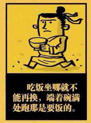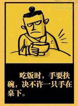 我记得很小的时候,我吃饭如果只用一只手拿筷,另一只手放在桌子下面,必然遭来爸爸严厉的批评,即便现在,吃饭忍不住玩手机,被老爸看到,依然会奏起眉头说我吃饭要有吃饭的样子。筷子如果拿的太前也是要被说的。