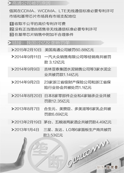 2月10日,历时14个月之久的高通反垄断案告一段落。国家发展和改革委员会当天宣布,对美国高通公司滥用市场支配地位实施排除、限制竞争的垄断行为依法作出处理,责令高通公司停止相关违法行为,并处以其2013年度在我国市场销售额8%的罚款,计60.88亿元。这一罚单创下我国反垄断罚款的历史最高。