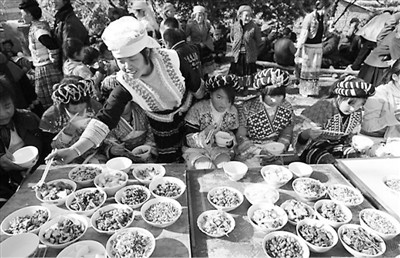 杀年猪当天,主人还要邀请本家邻居和亲朋好友前来吃饭,俗称“杀猪饭”,一则联络感情,二则共迎新春。村寨里,往往这家请罢那家请,春节前后一个月成为远近闻名的“杀猪饭月”。请人吃杀猪饭是件喜庆隆重的事儿,可表达出来却十分低调——“来我家吃箸腌菜”。这或许就是保山人性情敦厚,为人谦和的一种表现吧。