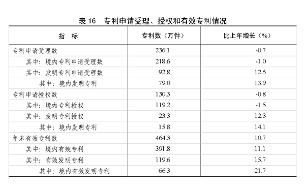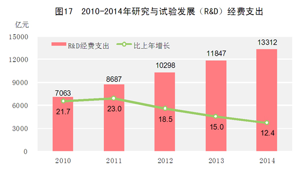 全年研究与试验发展(R&D)经费支出13312亿元,比上年增长12.4%,与国内生产总值之比为2.09%,其中基础研究经费626亿元。全年国家安排了3997项科技支撑计划课题,2129项“863”计划课题。截至年底,累计建设国家工程研究中心132个,国家工程实验室154个,国家认定企业技术中心1098家。全年国家新兴产业创投计划[37]累计支持设立213家创业投资企业,资金总规模574亿元,投资创业企业739家。全年受理境内外专利申请236.1万件,授予专利权130.3万件。截至年底,有效专利464.3万件。全年共签订技术合同29.7万项,技术合同成交金额8577亿元,比上年增长14.8%。
