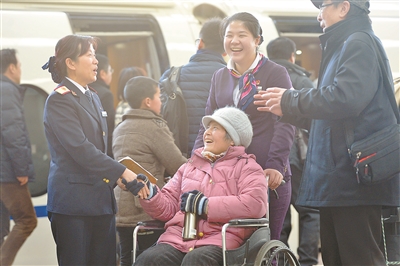 8:40,来自溧阳南流镇的蒋旭松肢体三级残废,乘坐K234次列车去石家庄,施凤英推着轮椅把他送上车。