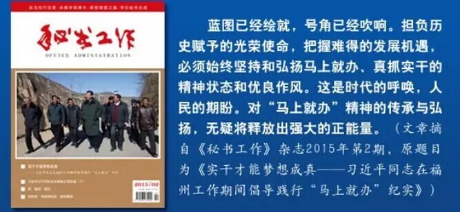 也就是从那时起,“马上就办”以其时不我待的紧迫感、狠抓落实的责任感、勤政为民的使命感,不仅在八闽大地悄然成风,更以其深刻的理论价值和现实的指导意义,穿越时空,历久弥新。