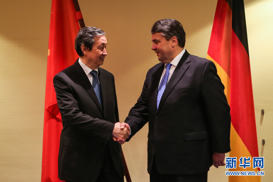 3月15日,中国国务院副总理马凯(左)在德国汉诺威会见德国副总理兼经济和能源部长加布里尔。当晚,马凯与默克尔共同出席汉诺威消费电子、信息及通信博览会开幕式并致辞。开幕式后,马凯与德国副总理兼经济和能源部长加布里尔就加强中德经济技术合作举行会谈。新华社记者张帆摄