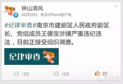 3月23日上午8:29,南京市纪委官微@钟山清风发布消息:南京市建邺区人民政府副区长、党组成员王德宝涉嫌严重违纪违法,目前正接受组织调查。”
