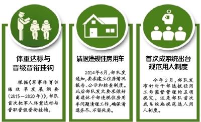 知情人士表示,这是部队首次实行军人体重强制达标、推行军事体育训练与人事管理挂钩、建立军事体育训练荣誉体系等配套政策。即在全军实行军人体重控制计划,实行体重强制达标制度,把军人体重达标与晋职晋级晋衔挂钩。