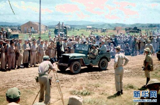 这是1945年8月21日,日本投降代表降机落地后,乘坐插有白旗的降车驶往指定地点。“八年烽火起卢沟,一纸降书落芷江”。在中国人民抗日战争胜利70周年即将到来之际,4月17日,位于湖南芷江侗族自治县的中国人民抗日战争胜利受降纪念馆首次对外公布日本在芷江投降的多张彩色照片,这些照片由当年美国飞虎队员约瑟夫·德拍摄。这些照片充满了历史感,主要场景有日本投降代表降机落地后,乘坐插有白旗的降车驶往指定地点的过程、美国大兵展示日本投降的外文报纸,以及芷江全城欢庆抗战胜利的场景,反映了中国人民迎接、欢庆、见证胜利的历史。新华社发