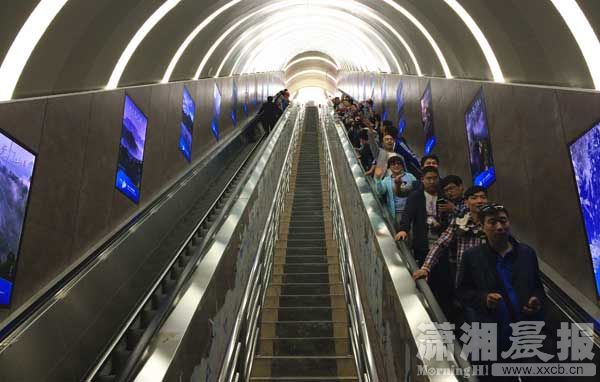4月25日,全球首条在山体隧道内安装的电梯—天门山穿山电梯正式开通运行。穿山电梯全程在山体隧道中运行,从天门洞底直达山顶,共12段,扶梯梯级运行总长度为897米,提升高度340米,总跨度为692米,有16台30米超大高度重载公交型自动扶梯、3台20米大高度重载公交型自动扶梯,拥有单向3600人/小时的输送能力。