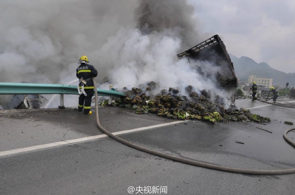 贵州一货车冲出护栏起火 32吨香蕉被烤焦