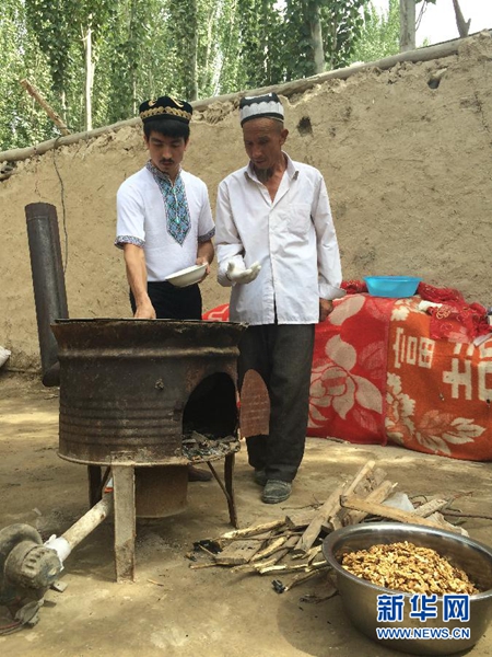 阿迪力·买买提吐热(左)在新疆老家与父亲一起制作切糕(2014年7月10日摄)。 新华社发
