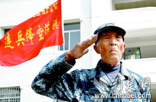 此时,老兵的身子像松树一样挺拔,两眼炯炯有神。