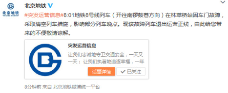 据北京地铁公司官方微博“北京地铁”消息,今日8点01分地铁8号线列车(开往南锣鼓巷方向)在林萃桥站因车门故障,采取清空列车措施,影响部分列车晚点。现该故障列车退出运营正线。
